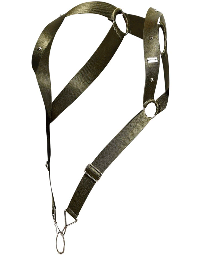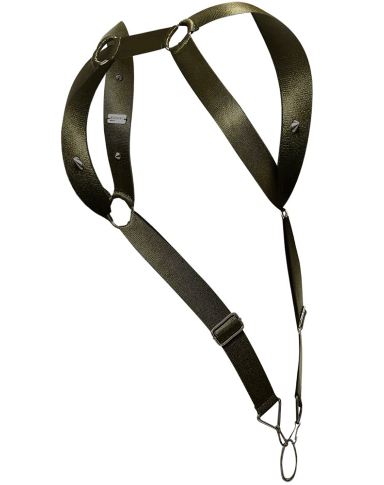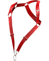 Wide straps on harness on an imitation leather fabric. Completely open back and front. Metallic accents.