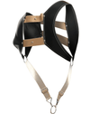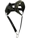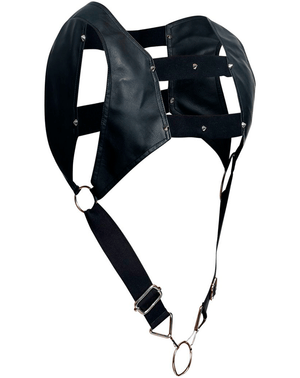 Wide straps on harness on an imitation leather fabric. Completely open back and front. Metallic accents.