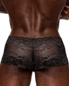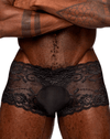 Mini short sheer pouch features a low cut scallop edged waist, high cut scalloped edged legs and a sheer mesh see thru pouch. Scallop edged floral stretch lace joins sheer stretch mesh and solid nylon stretch paneled inserts.