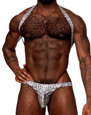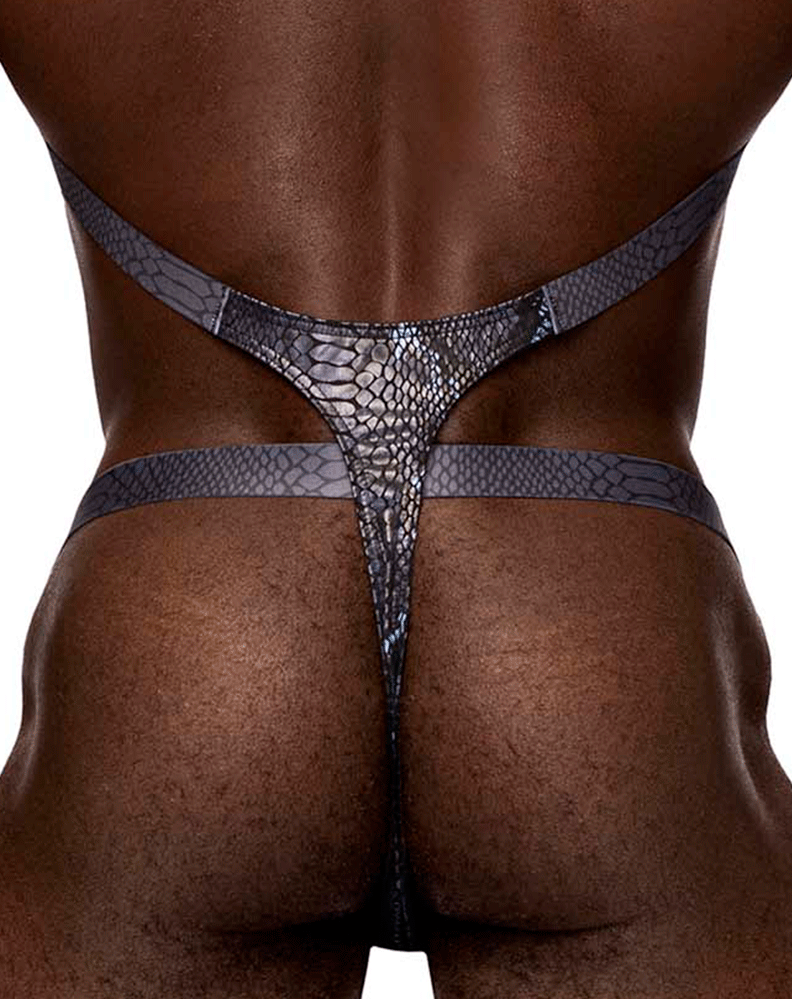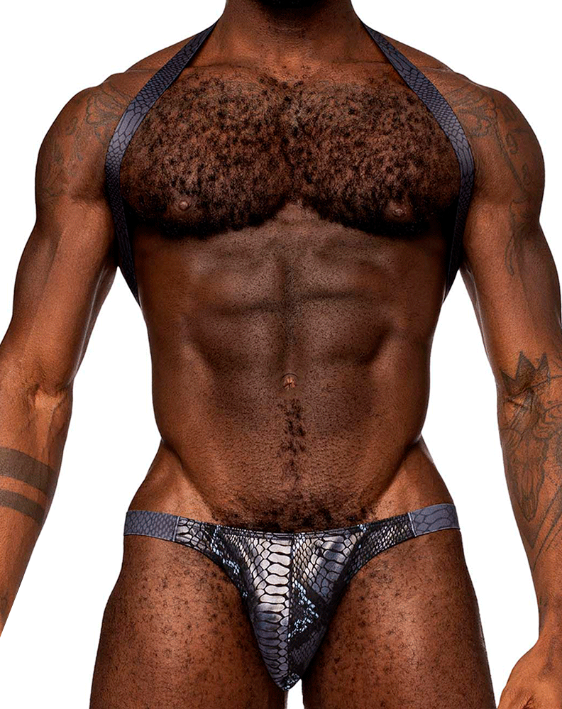 From the S'naked collection by Male Power, the Shoulder Sling Harness Thong features a behind the neck strap and sling, attached to a pouch thong. Poly Spandex metallic coated all way stretch printed fabric.