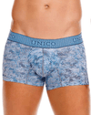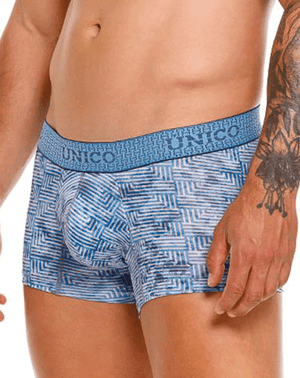 These men's boxer briefs from ÚNICO showcase a modern geometric pattern in shades of blue, creating a sleek and stylish look. The blue elastic waistband with the brand’s name in a subtle repeating pattern provides a comfortable and secure fit. Made from premium, breathable fabric, these boxer briefs offer exceptional support and flexibility for all-day comfort.