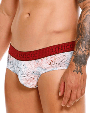 These men's briefs from ÚNICO showcase a vibrant abstract print in shades of white, blue, and red, creating a modern and artistic look. The red elastic waistband with the brand’s name in a subtle repeating pattern adds a bold contrast. Crafted from high-quality, breathable fabric, these briefs provide optimal comfort and support for all-day wear.